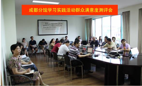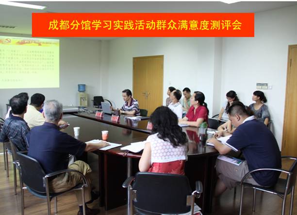 按照省直工委和成都分院党组学习实践活动领导小组关于开展学习实践活动的工作安排和部署,国家科学图书馆成都分馆于2009年8月17日召开了深入学习实践科学发展观活动群众满意度测评会。成都分馆党员代表、中层干部、非党员代表、离退休干部代表等25人参加了测评会。