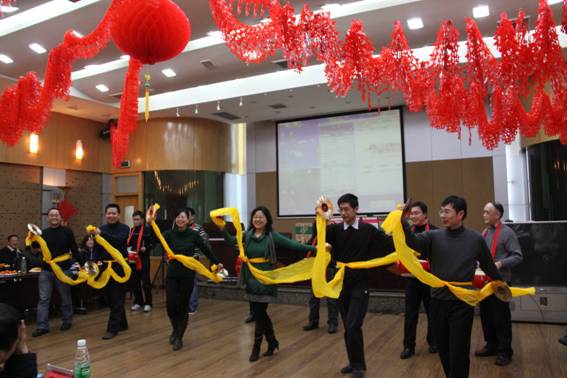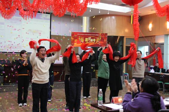 首先亮相的是网络部与业务处工会小组的《恭贺新禧》锣鼓表演,欢快的锣鼓声为大家敲响了新春的祝福,姑娘小伙子们手中亮丽的红绸飞扬、跳跃,喜庆的颜色洒满了舞台。信息服务部工会小组送上的戏曲《女驸马和花木兰选段》韵味十足,赢得了大家的一致好评,男声小合唱《游击队之歌》、女声小合唱《喀秋莎》也是悦耳怡人。离退休老干部的舞蹈《开门红》由6位老同志出演,尽管年逾花甲,他们仍然精神面貌极佳,舞步从容、优美,获得了热烈的掌声。情报研究部工会小组选送歌曲《感恩的心》,别出心裁地配上手语表演,更好地诠释了歌曲的内涵。在歌舞、小品、诗朗诵节目中,还穿插有魔术表演、“合力吹气球”游戏和幸运抽奖,抽奖活动更是激发起一阵阵激动欢快的热浪。最后,综合办工会小组欢快的健美操《龙腾虎跃迎新春》将文艺演出推向了高潮。新春团拜会在欢乐、祥和的祝福声中圆满结束。