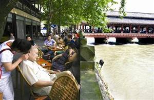 震后2年来的今天,我们怀揣着重游都江堰的心愿,终于踏上了文明古城的土地。维修后的离堆公园、宝瓶口、虎头岩依稀可见地震痕迹。亲临离堆,远眺上游安澜索桥横贯大江南北;近观都江堰扼锁大江,鱼嘴、金刚堤、飞沙堰和人字堤联成一线,把江水分为内江和外江,受损的堤坝已基本修复。向西如半岛一样深进内江,南有溢洪堰,北有宝瓶口,正中建有伏龙观,感叹李冰父子留给全人类最珍贵的历史遗产!