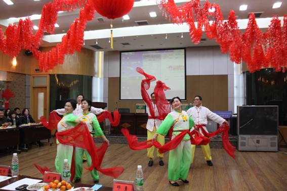 首先亮相的是网络部与业务处工会小组的《恭贺新禧》锣鼓表演,欢快的锣鼓声为大家敲响了新春的祝福,姑娘小伙子们手中亮丽的红绸飞扬、跳跃,喜庆的颜色洒满了舞台。信息服务部工会小组送上的戏曲《女驸马和花木兰选段》韵味十足,赢得了大家的一致好评,男声小合唱《游击队之歌》、女声小合唱《喀秋莎》也是悦耳怡人。离退休老干部的舞蹈《开门红》由6位老同志出演,尽管年逾花甲,他们仍然精神面貌极佳,舞步从容、优美,获得了热烈的掌声。情报研究部工会小组选送歌曲《感恩的心》,别出心裁地配上手语表演,更好地诠释了歌曲的内涵。在歌舞、小品、诗朗诵节目中,还穿插有魔术表演、“合力吹气球”游戏和幸运抽奖,抽奖活动更是激发起一阵阵激动欢快的热浪。最后,综合办工会小组欢快的健美操《龙腾虎跃迎新春》将文艺演出推向了高潮。新春团拜会在欢乐、祥和的祝福声中圆满结束。