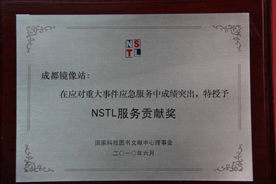 今年是国家科技图书文献中心(NSTL)成立十周年,在近日举行的国家科技文献共建共享十周年大会上,成都镜像站等6家单位被授予“NSTL服务贡献奖”。