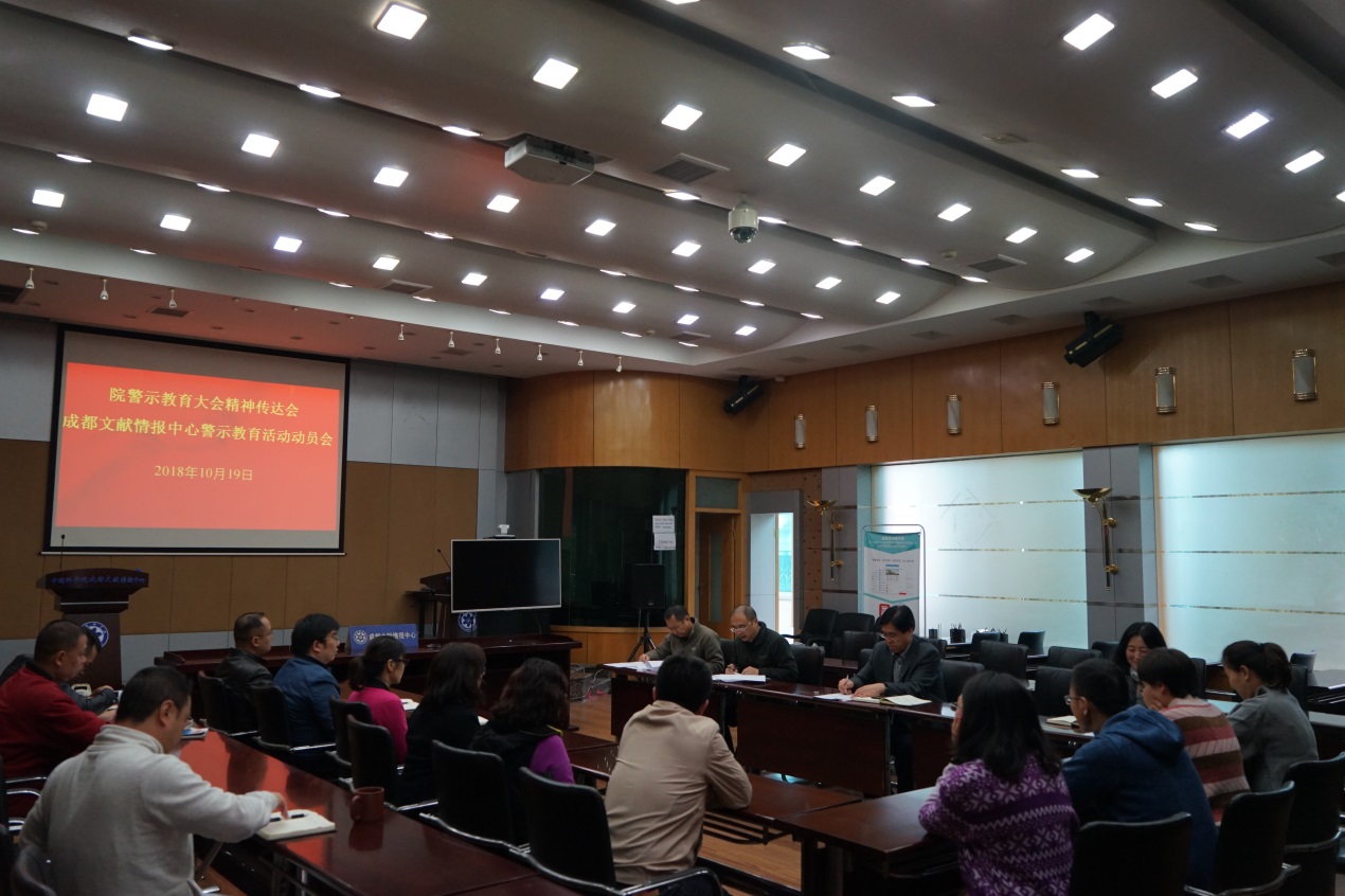 10月19日上午,成都文献情报中心召开全院警示教育大会精神传达会暨中心警示教育活动动员会,中心主任张志强,党委书记邓勇,纪委书记房俊民,中层领导干部,党支部书记参加会议,会议由邓勇主持。