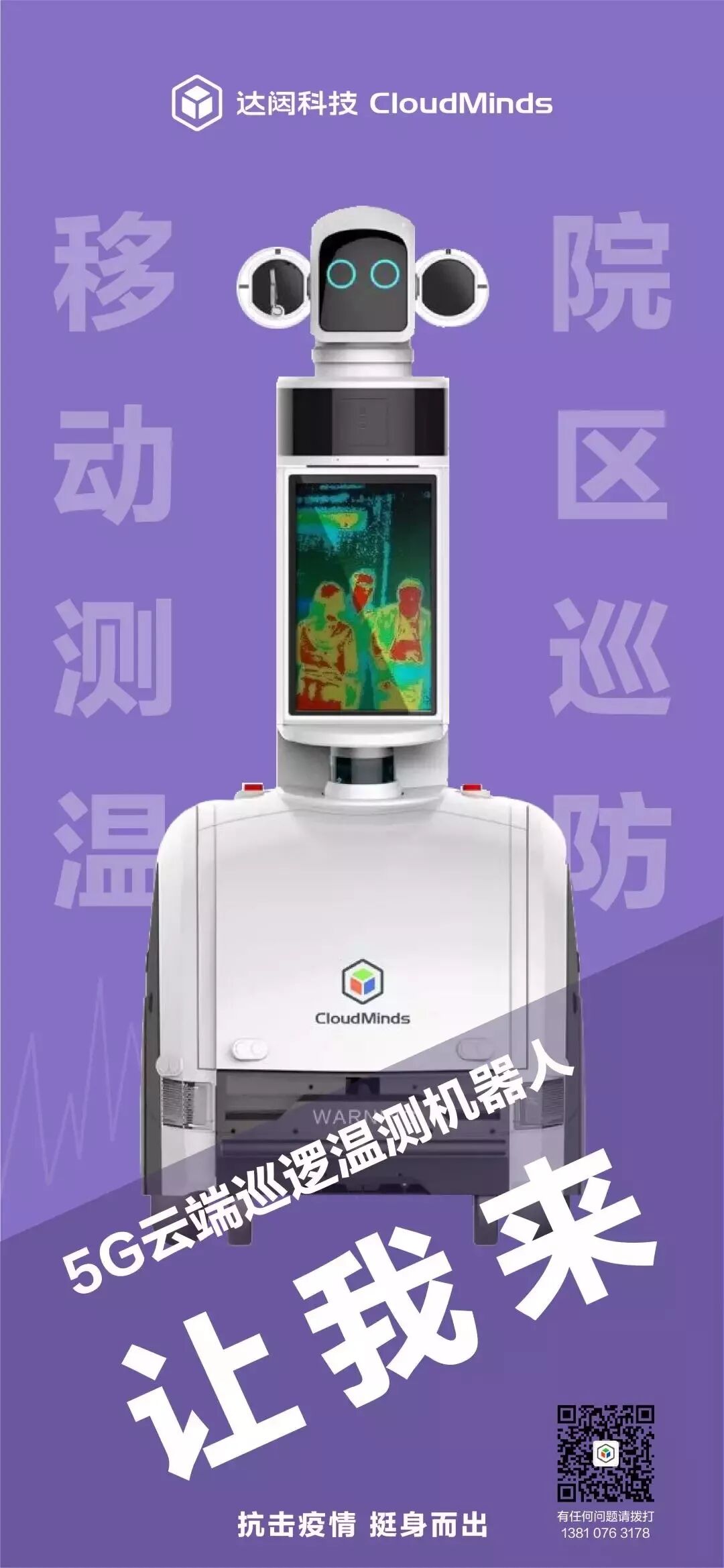 达闼科技与中国移动共同定制的5G测温巡查机器人已经发往武汉同济天佑医院和上海第六人民医院。5G测温机器人通过红外测温仪等传感器探测人体体温,一旦发现异常,会及时发出告警上报,避免测温人员的频繁、长时间工作,大幅度减少了疫情传播,提升了病区隔离管控水平。
