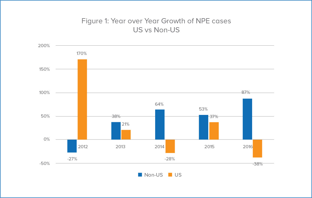 2017年3月,知识产权案例数据库Darts-ip发布报告称,NPE(Non-Practicing Entity,非执业实体)专利诉讼正成为一个全球性问题,美国的专利改革和新专利法案使NPE引起的专利诉讼减少,可能会促使NPE转向美国以外的区域。报告讨论了美国境外的NPE活动,包括NPE诉讼案件的增长速度、受理法院、涉及的产业以及对企业的影响。