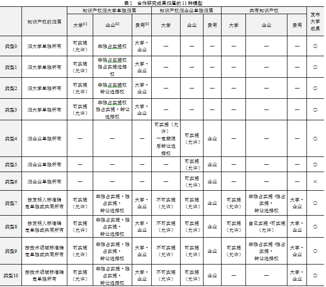 表1为合作研究成果归属的11种模型。在进行模型选择时需考虑以下因素:(1)对研究的贡献等;(2)归大学所有时对知识产权的处理;(3)是否有必要通过大学发布成果;(4)成果的归属方法;(5)是否留有共有的余地。